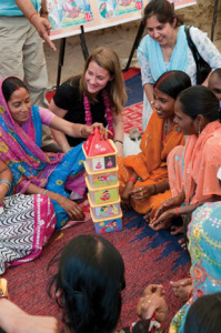 Melinda French Gates and participants at a Sure Start Project initiative to promote maternal and newborn health in Kathghara Village, Fatehpur District, U.P., India on March 23, 2010. The women are playing a stacking game to promote family wellness.