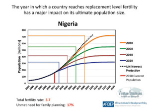 The UN population projections have assumed since the spring of 2010 that all but a small number of the fastest growing countries will reach replacement level by 2100. This is the Da Vinci Code at its worst. In parts of West Africa, current observable rates of increase in the use of contraception means that it will take over 90 years for countries to reach replacement level fertility (just over 2 children on average). Even when replacement level fertility is achieved, the population will go on growing for several generations, because of the enormous number of children already born.